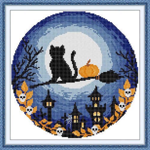 Halloween Black Cat Cross Stitch Kit - Spooky Stamped Aida Embroidery Set | Joy Sunday