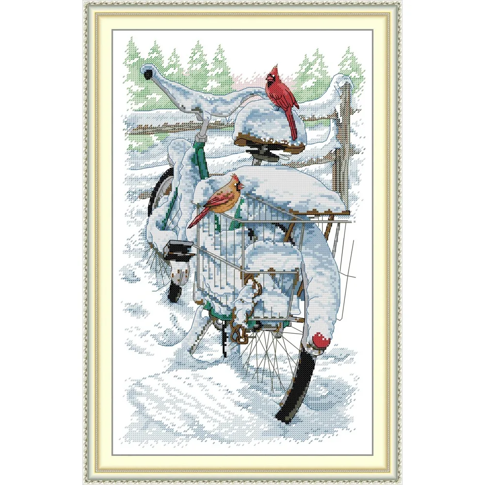 Red Bellied Bird on Bicycle Embroidery Kit - Whimsical Animal Cross Stitch Set