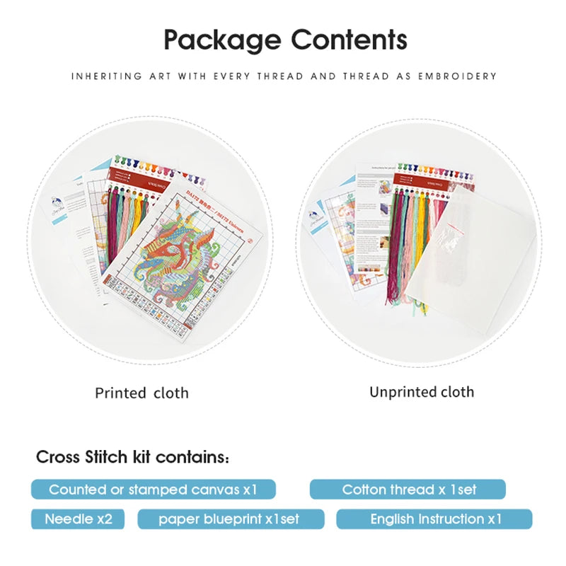 5. White fabric (for example: 14CT White Cloth and 14CT Counted Product), the canvas is white, there is no printed pattern on the canvas,and the embroidery can be performed according to the drawings.