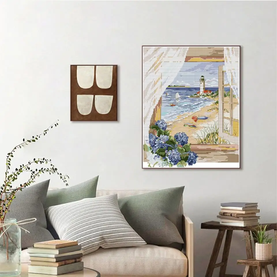 Window Seascape Printed Cross Stitch Embroidery Kit - AIMDIY